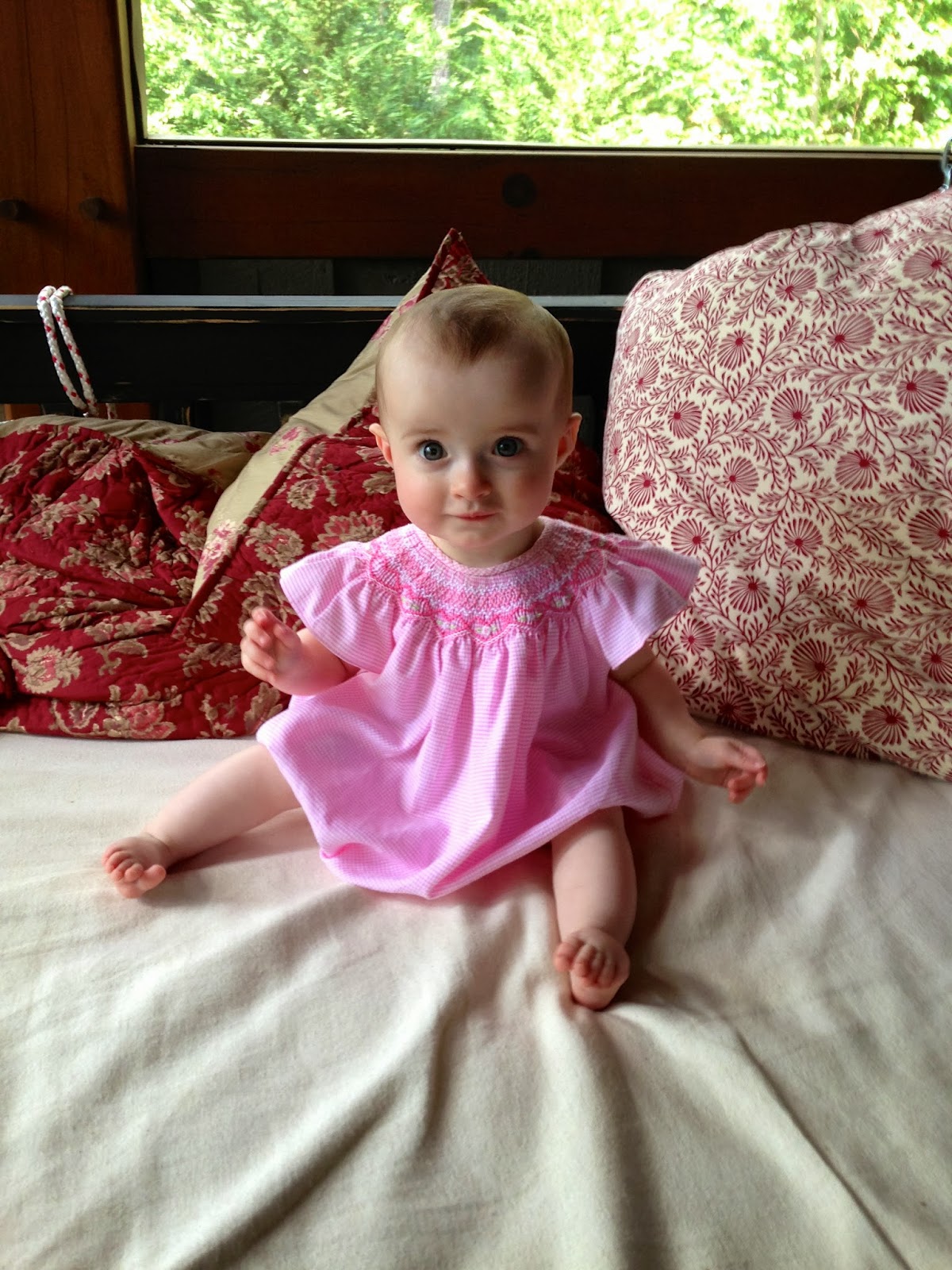 After our first visit,we learned to pack swimsuits.Photo-op I couldn't resist.Perfectly content remaining dry on Mommy's lap.Upped the fun quotient when cousins tagged along.(We seem to have a surplus of girls in our life.)For my birthday in July, Lindsay surprised me (really, surprised me. I did not see this gift coming.) with a bicycle with a baby seat already installed. I LOVED this instant motivator to both enjoy the outdoors and get moving. At one time or another, each girlie has spent time riding not-shotgun.Carter provides the toughest workout,Murphy keeps me entertained, and Wrighty falls asleep almost immediately.I'm so thankful to look back on our summer days and feel like I actually got outside and enjoyed them rather than being a summer hibernator basking in the comfort of an air conditioner.Mild afternoon + a fresh peach = Summertime perfection